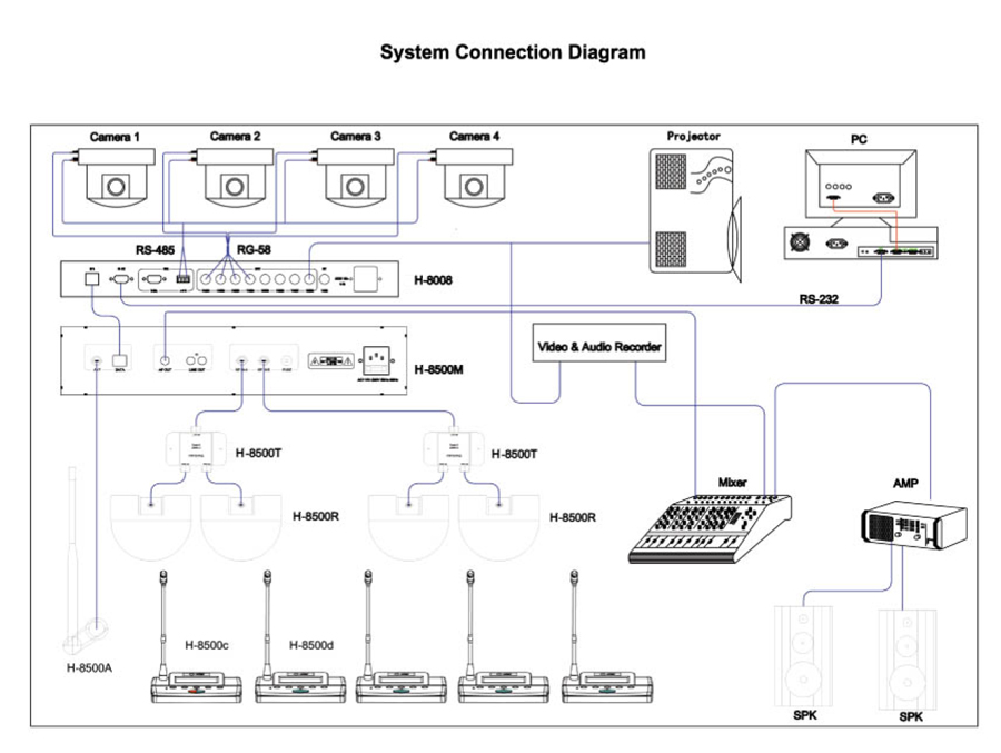 ◆ Fully functions(Discuss & video tracking), support FIFO(1,2,3),Limit(1/2/3) and chairman only mode, microphones in one system up to 128 units